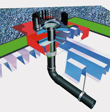 Fließt Wasser ab, dann geschieht das immer mit einer Wirbelbildung am Ablauf. Dabei wird in der Mitte des Ablaufes Luft mit angesaugt und gelangt ins Rohrsystem. Diese Luft verhindert eine Vollfüllung der Leitung und damit auch einen Absaugeffekt. Deshalb sind die Dachabläufe bei Druck-Entwässerungs-Systemen mit einer Art Kappe ausgestattet, die oben geschlossen ist und das Wasser nur an den Seiten einfließen lässt. Der Luft ist der Weg in die Rohrleitung also versperrt. Natürlich entsteht nicht beim ersten, leichten Nieselregen ein Absaugeffekt. Der kann erst dann eintreten, wenn so viel Wasser abfließt, dass sich die angeschlossene Regenwasserleitung vollständig mit Wasser füllt. Solange das nicht der Fall ist, wird das Dach ohne Saugwirkung entwässert. Da die Rohre kleiner sind als bei einer herkömmlichen Dachentwässerung, schlucken sie in dieser Phase des Betriebes auch weniger Wasser. Es kommt zu einem gewollten Aufstauen von Regenwasser auf dem Dach. Dieser Aufstau sorgt dann rasch für die Bildung einer geschlossenen Wassersäule, die durch die Leitung gedrückt wird. Da die Sammelleitungen ohne Gefälle verlegt werden, wird das Wasser allein durch den geodätischen Druck, der durch die Höhendifferenz zwischen Wasserstand auf dem Dach und Mitte der Sammelleitung entsteht, bewegt. Erreicht die Wassersäule die Fallleitung, bewirkt ihr Abstürzen, dass der Saugeffekt entsteht. Jetzt fließt das Wasser nicht mehr einfach nur in die Dachabläufe. Es wird nun eingesaugt. Die Druck-Entwässerung ist angelaufen.