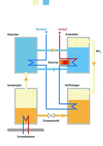 Das Kältemittel Ammoniak (NH3) wird aus dem Absorptionsmittel Wasser durch Wärme (hier durch den modulierenden Ölbrenner) im so genannten Austreiber „ausgetrieben“. Das gasförmige Kältemittel gelangt dann in den so genannten Verflüssiger. Dem Kältemittel wird durch die Heizungsanlage Wärme entzogen und es verflüssigt sich. Das unter Druck stehende flüssige Kältemittel wird über ein Drosselventil entspannt und verdampft. Die für die Verdampfung benötigte Wärme wird der Umwelt entzogen. Dann wird das nun wieder gasförmige Kältemittel in den Absorber geführt und erneut vom Lösungsmittel aufgenommen. Hierbei wird Wärme freigesetzt, die von der Heizungsanlage genutzt werden kann. Das Wasser mit dem Kältemittel fließt zum Austreiber, der Kreislauf schließt sich.