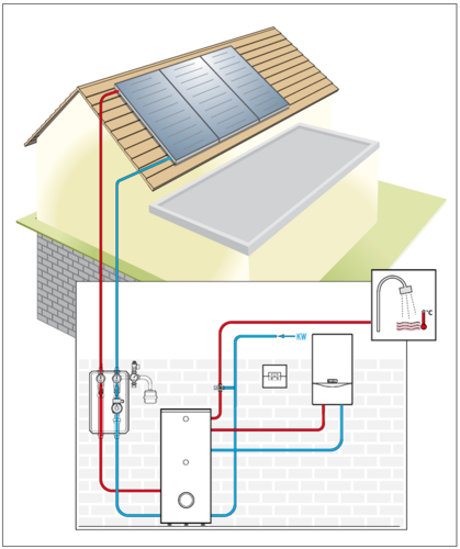 ab. Den kurzzeitigen Ausgleich zwischen Wärmeangebot des Kollektors und Warmwasserbedarf übernimmt der Solarspeicher.