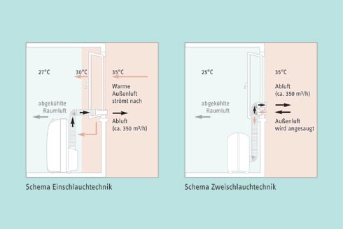 „Im ersten Schlauch wird die Außenluft angesaugt, welche die dem Raum entzogenen Energie aufnimmt und dann in einem geschlossenem Kreislauf über den zweiten Schlauch nach außen abführt. So wird die Raumluft gekühlt, ohne dass ständig nachströmende warme Außenluft den Effekt der Kühlung wieder zunichte macht. Die Wunschtemperatur im Raum wird erheblich schneller und mit wesentlich geringerem Stromverbrauch erreicht, was sich natürlich deutlich bei Wirtschaftlichkeit und Amortisation bemerkbar macht.