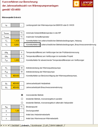 Die Jahresarbeitszahl einer Wärmepumpe muss im Rahmen des Marktanreizprogramms (MAP) und des Erneuerbare-Energien-Wärmegesetzes (EEWärmeG) rechnerisch nachgewiesen werden. Die Berechnung erfolgt nach VDI 4650. Diese Richtlinie wurde überarbeitet, um die ganze Bandbreite heutiger Wärmepumpenanlagen darstellen zu können. Seit Anfang März 2009 ist die aktualisierte Fassung erhältlich. An dieser Stelle steht eine Berechnungshilfe im Excel-Format gemäß der Neufassung zur Verfügung.