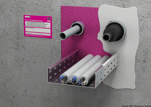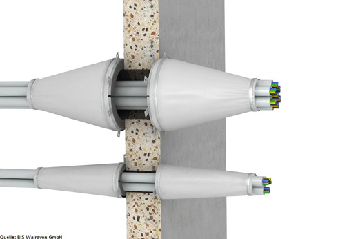 4. Die Kabelbandage: Hier werden Kabelstränge mittels einer Manschette, einer Bandage sowie einer speziellen Brandschutzfüllmasse abgeschottet.