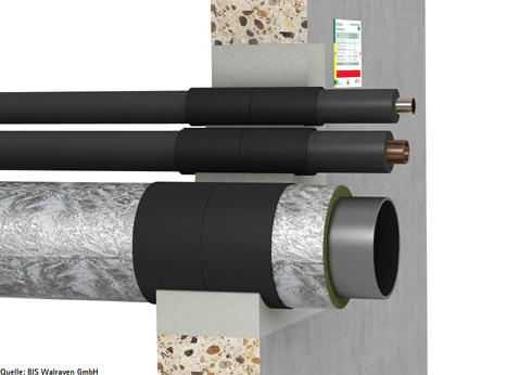 Als gängige Alternative zum Einzelschott gibt es auch die Möglichkeit der Streckenisolierung aus nicht brennbarem Material. Dabei handelt es sich beispielsweise um synthetischen Kautschuk, wie ihn Richter+Frenzel mit seinem Produkt ‚Optiflex HT Schlauch’ anbietet - allerdings sind damit lediglich kleine Durchmesser zu isolieren. Flexibler und gebräuchlicher ist Steinwolle mit einem Schmelzpunkt größer oder gleich 1.100°C, wie sie etwa von den Herstellern ‚Rockwool’ oder ‚Isover’ angeboten wird. Üblich und sehr effektiv ist hier die Conlit-Schale von ‚Rockwool’, die noch enger verpresst ist wie eine normale Steinwolldämmung. Die Schale wird um das Rohr gelegt und dieses dann durch die Wand oder Decke geführt. Vor und nach der Conlit-Schale schließt sich je nach Bedarf eine unterschiedlich lange Steinwolldämmung an. Die Streckenisolierung gilt als sehr sicher, allerdings auch etwas teurer. Muss jedoch ohnehin eine Wärme- oder Kältedämmung gemacht werden, so bietet sich Steinwolle als Dämmmaterial mit Zusatznutzen an. Allerdings wird etwas Wohnraum eingebüßt, denn man benötigt deutlich größere Schächte, da eine ausreichend dicke Conlit-Schale um jedes Rohr zusätzlichen Platz benötigt. Es ist auch zu beachten, dass nur gerade Strecken ohne Abzweigungen so isoliert werden können, was den Einsatzbereich etwas einschränkt.