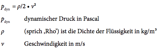 Nun wird also die Kappe abgenommen und der Druck von 1 bar würde zumindest teilweise umgewandelt in Bewegungsdruck und einen gewissen restlichen Anteil an statischem Druck. Dieser statische Druck würde weiterhin gegen die Rohrwand drücken. Der dynamische Druck einer Flüssigkeit ergibt sich aus: