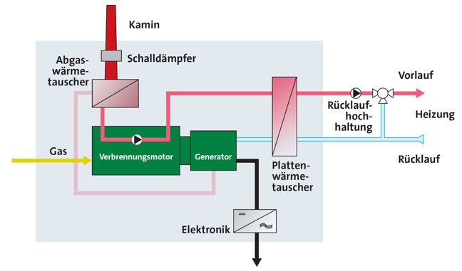 Die dabei entstehende Abwärme wird über einen Plattenwärmetauscher ausgekoppelt und zur Heizung und Warmwasserbereitung verwendet. Die optimierte Nutzung der Abgaswärme trägt hierbei zur hohen Effizienz des Mini-BHKWs bei. Auf diese Weise wird die eingesetzte Energie doppelt genutzt und so ein wesentlich höherer Wirkungsgrad als in modernen Großkraftwerken erzielt.