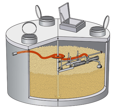 Neben der Frage der Befüllung ist die zweite wichtige Baustelle die der Entleerung. Fachleute sind sich einig, dass die bisherigen Entnahmesysteme zuviel kosten und den Lagerraum nicht optimal nutzen. Wer die Pellets im Lager unten entnimmt, muss stets dafür sorgen, dass die kleinen Stäbchen nachrutschen. Mit dem Sonnen-Pellet-Maulwurf wurde ein Mini-Roboter geschaffen, der sich robust im Speicher bewegt. Er krabbelt buchstäblich über die Pellets, wühlt sich mit kleinen Schaufelrädern selbsttätig und langsam von oben durch das Material und saugt dabei die Pellets ab. Das Lager kann damit vollständig geleert werden. Durch die automatische Entnahme von oben ist die gleichmäßige Verteilung des Feinstoffanteils gewährleistet, eine wesentliche Voraussetzung für den störungsfreien Betrieb des Brenners. Das neue Entnahmesystem „Maulwurf 6000“ ist eine Gemeinschaftsentwicklung der Mall GmbH und Schellinger KG für Anlagen bis 200 kW Heizleistung. Es entnimmt die Holzpellets ebenfalls behutsam von oben und bewegt sich langsam im Kreis. Der unterirdische Speicher und die automatische Entnahme bilden eine Einheit.
