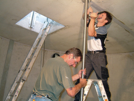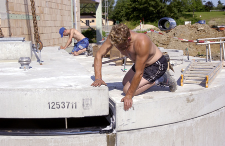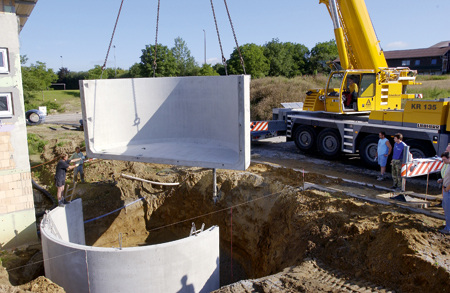 Was die Brennstoffmenge angeht, muss man nicht denken, dass die Erdeinlagerung nur wenig Bevorratung erlaubt. Ein Behälter mit einem Lagerraum von 15 m³ fasst den Inhalt eines kompletten Silofahrzeuges. Ein Behälter mit 22 m³ Lagerraum schluckt den Inhalt eines Lastzuges mit Anhänger. Damit werden für den Nutzer die Frachtkosten des Brennstoffes auf ein Minimum reduziert. Mit den genannten Behältervolumen ist aber lange noch nicht die Grenze der unterirdischen Lagerkapazität erreicht. So wurde vom Behälterhersteller Mall kürzlich in Gaienhofen am Bodensee ein Riese mit 60 m³ Lagerraum und 35 t Fassungsvermögen in der Erde versenkt. Für die Erstbefüllung waren vier Silofahrzeuge angerückt. Die örtliche Feuerwehr, die aus dem Behälter die Heizung ihres neuen Gerätehauses beschickt, konnte sich bei derartig großen Einzelabnahmen über einen entsprechend günstigen Pellet-Preis freuen. Und das ganz sicher auch dauerhaft. Denn Edelstahl und hochwertiger Beton machen die Komponenten beständig und zuverlässig. Der Hersteller produziert, liefert und montiert vor Ort die gesamte Lager- und Entnahmetechnik. Dazu gehören der Anschluss an die Steuerung des Heizkessels sowie die Montage der Stahlbeton-Fertigteile.
