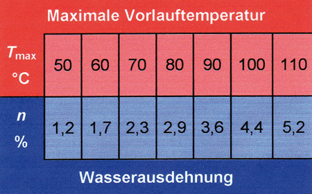 Das Ausdehnungsvolumen [Ve] des Heizwassers errechnet sich nach DIN 4807-2 aus der folgenden Formel: Anhaltswerte für die prozentuale Wasserausdehnung [n] können der Tabelle entnommen werden