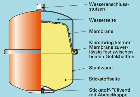Beim Aufheizen würde Heizungswasser über das Sicherheitsventil abfließen. Kühlt sich das Wasser wieder ab, „zieht“ es sich zusammen. Die Folge wäre ein Unterdruck, durch den über Stopfbuchsen und lösbare Verbindungen Luft in die Heizungsleitungen gesaugt würde. Und Luft in der Heizung ist ja bekanntlich schlecht. Es käme zu Gluckergeräuschen, Heizkörper würden nicht mehr warm und das Korrosionsrisiko wäre um ein Vielfaches größer. Letzteres nicht zuletzt deshalb, weil der Wasserverlust bei jedem Aufheizen ein Nachfüllen von sauerstoffhaltigem Trinkwasser erforderlich machen würde. Um diese Probleme gar nicht erst aufkommen zu lassen, wird in einem geschlossenen Warmwasser-Heizungssystem entsprechend der DIN EN 12828 [1] ein Membran-Ausdehnungsgefäß (MAG) eingebaut. Ein MAG ist ein Behälter, der durch eine Membrane in zwei Bereiche, den Wasser- und den Gasraum, aufgeteilt ist. Der Gasraum ist mit einem Inertgas (z. B. Stickstoff) werkseitig mit 0,5 bar, 1,0 bar oder 1,5 bar Vordruck gefüllt. Vor Ort muss der Vordruck überprüft und wenn erforderlich auf den entsprechenden Wert einreguliert werden. Dieser Vordruck soll verhindern, dass bereits beim Füllen der