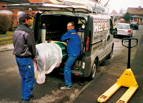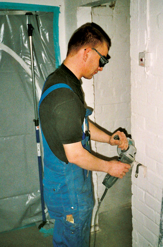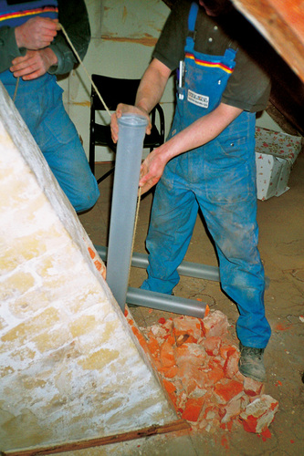 Die Montage des Blockheizkraftwerkes nahm mehrere Tage in Anspruch. Damit man den Dachs aufstellen kann, ist ein Podest erforderlich, da die Anlage über 500 kg wiegt. Das Bewegen des Dachses erfolgte mit einer Transporthilfe, die es auch bei engen Verhältnissen erlaubt, das BHKW entsprechend zu manövrieren. Ein weiterer Kraftakt war die Platzierung des Speichers. In diesem Fall war der Speicher so groß, dass er nicht durch die Tür des Aufstellraumes passte. Hier musste nun die Tür verbreitert werden. Damit der dabei entstehende Staub sich nicht im gesamten Haus verteilen konnte, wurden so genannte Staub-Schutzfolien an den Eingängen der umliegenden Räume befestigt. Nach dieser Schutzmaßnahme sollte mit dem großen Trennjäger der Türrahmen vergrößert werden. Es flog jedoch jedes Mal die Sicherung heraus, als der Trennjäger in Funktion gesetzt wurde. Also musste der kleine Trennjäger eingesetzt werden. Das bedeutete, von beiden Seiten arbeiten zu müssen. Nachdem der Speicher in seine vorgesehene Position gebracht wurde, begannen die Installationsarbeiten. An diesem Tag wurde noch die Pumpengruppe an den Dachs angeschlossen und das Abgasrohr aus Polypropylen verlegt.