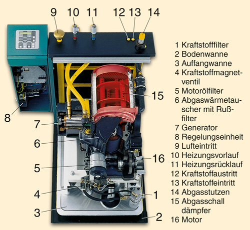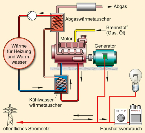 Prinzipiell besteht ein BHKW aus einem Motor und einem Generator. Der Motor kann mit verschiedenen Energieträgern betrieben werden. Neben dem Erdgas oder dem Heizöl also auch mit Pflanzenöl, Biogas oder Pellets. Wird das BHKW mit Öl betrieben, arbeitet die Maschine nach dem Prinzip eines Dieselmotors. Wird das BHKW mit Gas betrieben, arbeitet es nach dem Prinzip eines Otto-Motors. Die erzeugte Wärme ist eigentlich ein „Abfallprodukt“: Damit das BHKW weiterlaufen kann, muss die Wärme abgeführt werden. In großen Kraftwerken geschieht das über die Kühltürme. In einem Mini-BHKW werden mit Hilfe eines Wärmeüberträgers das Abgas, der Motor, das Schmieröl und gegebenenfalls auch der Generator gekühlt. Die Wärme wird einem Speicher zugeführt. Der Motor treibt einen Generator an. Während bei einem herkömmlichen Wärmeerzeuger nur die Wärme genutzt wird, wird bei der Verbrennung im Motor Wärme- und Bewegungsenergie erzeugt. Die Bewegung wird auf den Generator übertragen. Elektrischer Strom entsteht. Aus dieser Kombination – Wärme- und Stromerzeugung – ergibt sich der hohe Wirkungsgrad. Den erzeugten Strom kann man selber verbrauchen oder an den jeweiligen Netzbetreiber verkaufen. Der hohe Wirkungsgrad macht das BHKW wirtschaftlich. Zudem wird durch die Einsparung von Brennstoffen der Ausstoß von klimaschädlichem Kohlendioxid reduziert.
