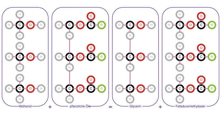Methanol plus pflanzliche Öle ergibt Glycerin plus Fettsäuren