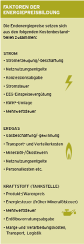 Die Energiekosten für private Verbraucher setzen sich je nach Energieträger und Verbrauchergruppe unterschiedlich zusammen. So tragen die privaten Haushalte beim Erdgas einen deutlich höheren Netznutzungs- und Personalkostenanteil als die Industrie. Die Abhängigkeit von den Weltmarktpreisen ist dagegen wesentlich geringer. Beim Kraftstoff treiben vor allem die Verbrauchssteuern