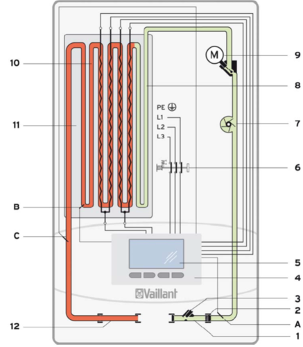 Ist die Auslauftemperatur zu hoch, schaltet der Sicherheitstemperaturbegrenzer STB (C) die Elektronik sofort ab. Der Sicherheitsschalter schaltet ebenfalls, wenn aufgrund einer Störung noch elektrische Leistung an den Heizwendeln anliegt, obwohl der Durchfluss kleiner als 1,2 I/min ist.