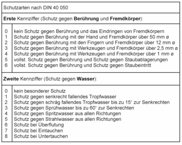 Häufig wird der Begriff "Schutzart" auch mit "Schutzklasse" verwechselt. Beides sind jedoch Begriffe die technisch etwas ganz anderes beschreiben. Doch nun ersteinmal die Schutzart. Nach DIN 40 050 sind für elektrische Maschinen (und auch für andere Betriebsmittel wie Transformatoren, Schalt- und Installationsgeräte) verschiedene Schutzarten zum Schutz gegen Berührung, Fremdkörper und Wasser, die durch die Kennbuchstaben IP (International Protection) und zwei Kennziffern zu kennzeichnen sind, erforderlich.