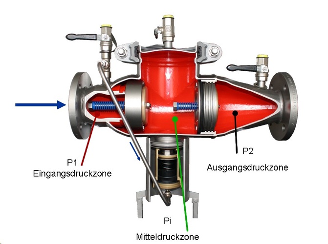 Zone ist genau vorbestimmt. Sinkt der Vordruck, sodass Gefahr besteht, dass Wasser zurückgedrückt oder rückgesaugt würde, schließt der Rückflussverhinderer zwischen Vor- und Mittelkammer spätestens bei einer Druckdifferenz von 140 hpa[1] und das Ablassventil in der Mittelkammer öffnet. Wasser strömt aus der Mittelkammer ins Freie[2]. Das Leitungssystem ist unterbrochen und gesichert. Der Rückflussverhinderer zwischen Mittel- und Ausgangskammer schließt ebenfalls. Er verhindert, dass Wasser aus den Leitungen nach dem Systemtrenner durch das Ablassventil wegströmt.