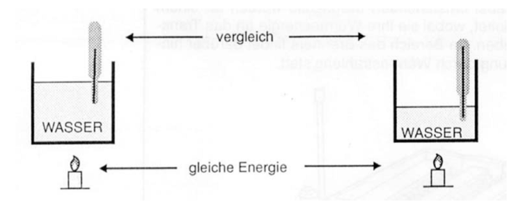 Im linken Glas befindet sich viel Wasser mit einer geringen Temperatur, im rechten Glas wenig Wasser mit einer höheren Temperatur. Die Energieinhalte sind in beiden Gläsern gleich.