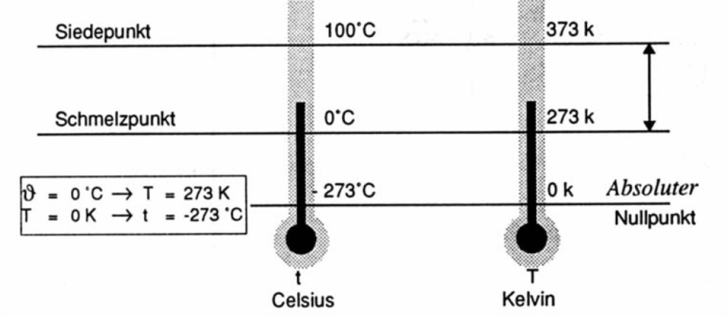 der Kelvintemperatur ist der absolute Temperaturnullpunkt (-273°C) mit 0K festgelegt. Dieser Zustand wird bei vollkommener Molekularstarre erreicht.