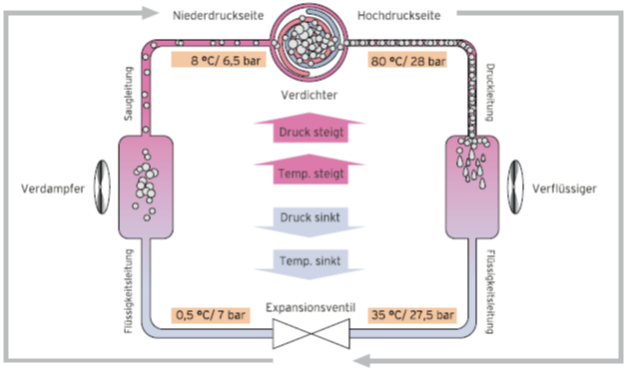 Der Verdichter (Kompressor) ist das Herzstück der Anlage. Hier wird das gasförmige Kältemittel zunächst verdichtet. Da dies in einem geschlossenen System geschieht, kommt es zu einem Druck- und Temperaturanstieg des Kältemittels. Dabei steigt die Temperatur des Kältemittels über die der Umgebungstemperatur und stellt somit sicher, dass die Wärmeabgabe des Kältemittels nach
