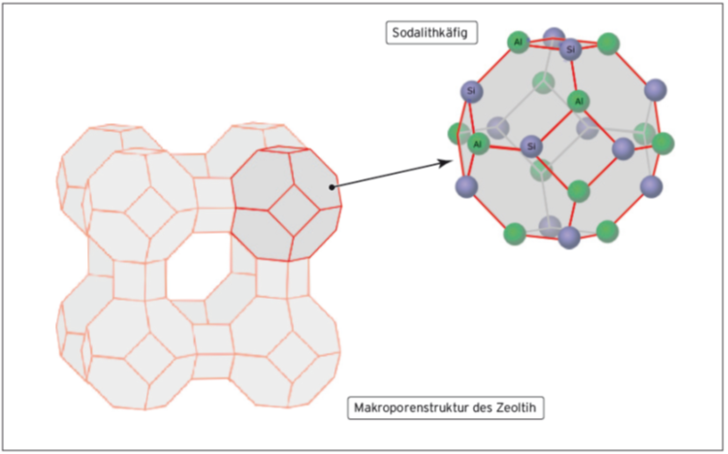 Die Aluminiumdioxid- (AlO2) und Siliciumdioxid- (SiO2) Atome bilden sogenannte Sodalithkäfige. Sehr viele von diesen Sodalithkäfigen