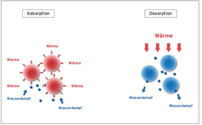 Die Bewegungsenergie des Wassermoleküls wird in Wärme umgewandelt. Diese sogenannte Adsorptionswärme wird dem Heizsystem als