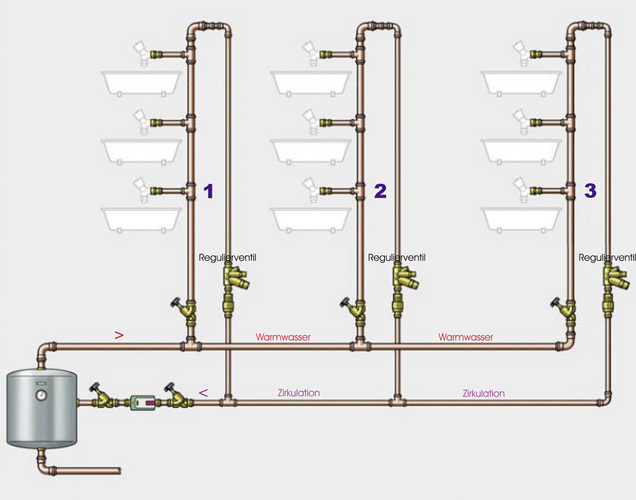 Die DVGW-Arbeitblätter W 551 und W 553 fordern etwas gegen die Verbreitung von Legionellen in Trinkwassernetzen. Man kennt die Biester und weiß auch wie man sie kriegen und ihnen den Rest geben kann. Daher gibt es eine einfache Regel für den Betrieb von Warmwassernetzen. Man hält das Wasser im System warm, zum Beispiel mit einer Zirkulationsleitung. Wasser mit einer Temperatur von 60 °C kommt dann raus aus dem Trinkwassererwärmer und muss beim Wiedereintritt in den Trinkwassererwärmer noch mindestens 55 °C warm sein. Da die Legionellen in diesem heißen Milieu nur geringe Überlebenschancen haben, reicht dies erstmal als Abwehrmaßnahme. Soweit, so gut. Klar ist, dass diese warmgehenden Leitungen gedämmt werden. Natürlich versucht man die Leitungsführung möglichst elegant und kurz zu gestalten. Weite Wege müssen, wegen der daraus resultierenden hohen Druckverluste mit einer entsprechend kräftigen Zirkulationspumpe überbrückt werden. Während bei kleinen überschaubaren Anlagen oft schon ein kleines Pümpchen ausreicht. Aber wie gewährleistet man den Verbleib der Stromfäden in einem verzweigten System?