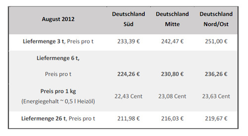 Der DEPV-Index ist der Durchschnittspreis für Holzpellets in Deutschland. Er liegt im August bei 228,41 EUR/t. Detailliert erhebt der DEPV den Pelletpreis in drei Regionen: In Süddeutschland sind Pellets mit 224,26 EUR/t am günstigsten, wenn 6 t abgenommen werden. In der Mitte der Republik kostet eine Tonne der kleinen Presslinge 230,80 EUR, in Nord- und Ostdeutschland zahlen Pelletheizer pro Tonne Qualitätspellets 236,26 EUR. Größere Mengen (26 t) wurden im August 2012 zu folgenden Konditionen gehandelt: Süd: 211,98 EUR/t, Mitte: 216,03 EUR/t, Nord/Ost: 219,67 EUR/t.