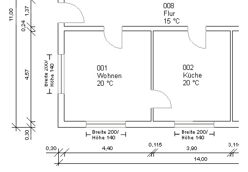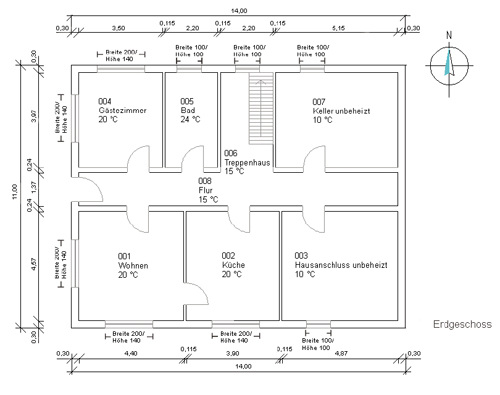 In unserem Beispiel betrachten wir den Wohnraum im Erdgeschoss. Nach der Beschreibung der allgemeinen Raumdaten wie Wohneinheiten, Raumnummern, Raumarten (mit den dazugehörigen Raumtemperaturen) und der Raumbezeichnung, erfolgt die Raumgeometrie. Bei der Ermittlung der Raumgeometrie ist darauf zu achten, dass dazu die Rauminnenmaße (lichte Maße) zu wählen sind. Im Ergebnis erhält man das Raumvolumen, welches zur Berechnung des Lüftungswärmeverlustes benötigt wird. Als weiteren Faktor für den Bedarf an Lüftungswärme ist der Mindestluftwechsel des Raumes anzugeben. Dieser ist abhängig von der Art der Raumnutzung. So hat ein Wohnraum nach Norm einen 0,5-fachen Luftwechsel in der Stunde, ein Badezimmer dagegen hat einen 1,5-fachen stündlichen Luftwechsel. Das Raumvolumen multipliziert mit dem Luftwechsel des Raumes ergibt den hygienischen Mindestluftvolumenstrom. Bei Wohngebäuden ohne mechanische Belüftung entspricht dieser oftmals dem Luftvolumenstrom aus dem der Lüftungswärmeverlust berechnet wird.