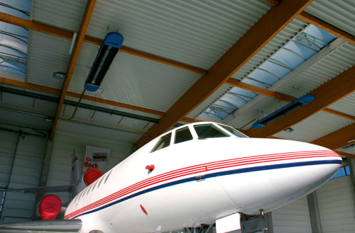 Diese Problemstellung ließ die Wahl auf eine Strahlungsheizung fallen. Heizstrahler übertragen Wärme nur durch Strahlung. Die Wärme wird erst dann abgegeben, wenn sie auf strahlungsundurchlässige Körper trifft. Da die Luft nicht erst erwärmt werden muss, um fühlbare Wärme zu erzeugen, ist die Strahlungsheizung für große und hohe Räume, wie in diesem Fall, besonders geeignet. Eine Lufterwärmung erfolgt nur indirekt über die vom Heizstrahler erwärmten Personen und Flugzeuge. Dunkelstrahler bestehen im Wesentlichen aus einem Gasbrenner, einem Wärme abstrahlenden Stahlrohr und einem Saugzugventilator mit Abgasanschluss am anderen Ende. Das Rohr gibt die Hitze der Flamme und des Abgases als Wärmestrahlung ab. Die matte, dunkle Rohroberfläche des Strahlrohres hat eine Temperatur von 280 bis 650 °C. Das Strahlrohr kann linear, U-förmig oder als Rechteck mit Bögen ausgeführt werden. Über dem Rohr ist ein Reflektor angeordnet, der die Wärmestrahlung nach unten in den Aufenthaltsbereich lenkt. Die Abgasabführung und auch die Zuleitung der nötigen Verbrennungsluft erfolgt über ein Luft-Abgas-System direkt über Dach. Ein raumluftabhängiges System wurde hier nicht installiert, da mit den Flugzeugen „treibstoffbetankte Fahrzeuge“ in der Halle stehen.