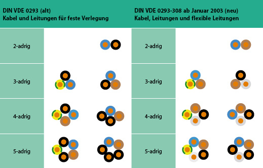 Die letzten beiden Auswahlkriterien, die elektrische und die mechanische Belastung, sind natürlich bei jeder Elektroanlage individuell festzustellen. In der Regel ist es aber so, dass in den technischen Unterlagen der Gerätehersteller (Wärmeerzeuger, Pumpen, etc.) Angaben zum fachgerechten Anschluss vorhanden sind. Diese müssen ganz klar beachtet werden. Am häufigsten werden die genannten Kabel und Leitungen in der dreiadrigen Variante (braun = L1 = Außenleiter 1, blau = N = Neutralleiter, grün-gelb = PE = Schutzleiter) und in der fünfadrigen Variante (braun = L1 = Außenleiter 1, schwarz = L2 = Außenleiter 2, grau = L3 = Außenleiter 3, blau = N = Neutralleiter, grün-gelb = PE = Schutzleiter) verwendet. Die Kabel und Leitungen eignen sich zum Anschluss von 230 / 400-V-Geräten wie Wärmeerzeuger, Pumpen, Fühler,