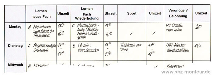 Wann fällt es Ihnen leichter klar zu denken? Morgens oder abends? Planen sie Ihre Lernzeiten so, dass Sie zu Ihren Eigenheiten passen. Es wäre unvernünftig, sich das Lernen selber schwer zu machen. Es lohnt sich, Ihren Tagesablauf zu überdenken und gegebenenfalls einige Veränderungen vorzunehmen. Legen sie Ihre Lernzeiten in den Tagesabschnitt, an dem Sie am aufnahmefähigsten sind. Gerade wenn Sie die Meisterschule beginnen, ändert sich Ihr gesamter Tagesrhythmus. Die Tabelle (oben) soll Ihnen helfen, Ihr Lernen zu strukturieren. Setzen Sie Prioritäten. Gehen Sie dabei nach folgender Methode vor: Ordnen Sie die Lernthemen nach drei Klassen z.B. Klasse A, B und C. Gruppe A sind besonders wichtige Lerngebiete, in Klasse B sind wichtige Aufgaben zu erfüllen und Klasse C enthält weniger wichtige Aufgaben, die der zusätzlichen Information dienen.