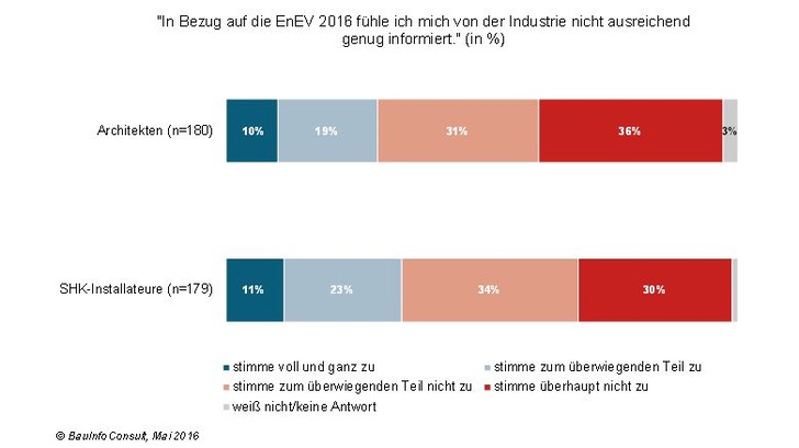 Gerade in diesem Punkt scheint noch nicht alles zur Genüge erledigt, denn knapp ein Drittel der 180 telefonisch dazu von BauInfoConsult befragten Architekten fühlt sich von der Industrie generell nicht ausreichend genug informiert, wenn es um die jüngste EnEV-Verschärfung von 2016 geht. Immerhin sind zwei Drittel der Befragten eher dazu geneigt sich als umfassend informiert zu sehen. Hier sollte die Industrie in ihrem ureigenen Interesse nachbessern und die Planer mit genügend EnEV Informationen versorgen.