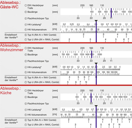 Mit dieser Aktion wurden feste Widerstände in das Rohrsystem eingebracht. Ebenso hätte man im Zulauf zum Heizkörper des Gäste-WCs das Kupferrohr ein wenig platt hauen können (bitte nicht praktizieren). Dadurch wäre der Widerstand erhöht worden und ein wesentlich größerer Anteil des strömenden Heizungswassers würde an dem Gäst-WC vorbei jagen, als wenn es einen unverminderten Querschnitt hätte. Mit dem skizzierten Verfahren lassen sich Bestandsanlagen effizient und kostengünstig einregulieren. Der Datenschieber erleichtert dabei die Vorgehensweise. Und idealerweise flitzt man nur mit diesem Schieber durch das Haus und findet jeden Einstellwert wie eben musterhaft beschrieben. In der Praxis sind natürlich auch noch ein paar andere Heizkörper am Markt eingebaut. Praktikabel ist es dann, wenn bei einem Ortstermin zur Erstellung des hydraulischen Abgleichs die entsprechenden Listen von Heizkörpern zur Hand sind. Über die Heizkörpermaße und gemäß einer angenommenen Vor- und Rücklauftemperatur lässt sich dann auf die Leistung des Heizkörpers schließen und wiederum der Einstellwert am Datenschieber ermitteln. Andere Ventiltypen erfordern andere Schieber oder auch Herstellertabellen. Aber das Prinzip, der Gedanke und der Erfolg, stellen sich ähnlich ein.