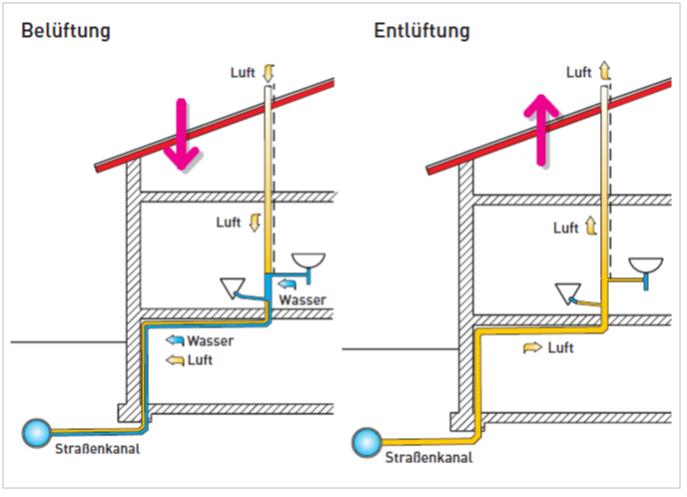 Schickt man Abwasser in einem Entwässerungssystem auf die Reise, ist also eine große Menge an nachströmender Luft nötig, um zu verhindern, dass es zur Unterdruckbildung kommt. Geschieht dies, weil der Luftweg versperrt ist, dann gluckert das Sperrwasser in den Geruchverschlüssen oder wird sogar aus ihnen abgesaugt. Übelriechende Kanalgase finden nun den Weg in die gute Stube.