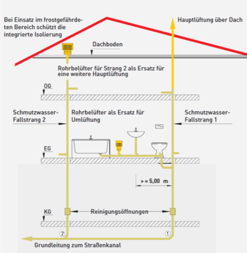 - In Ein- und Zweifamilienhäusern können Belüftungsventile an Stelle von Fallleitungen eingesetzt werden, wenn mindestens eine Fallleitung über Dach