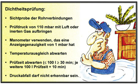 Vor Ausführung der Dichtheitsprüfung sollte man sich davon überzeugen, dass tatsächlich alle Verbindungsstellen fertig gestellt sind (Lötstellen gelötet, Pressverbinder verpresst, etc.). Dann wird Druckluft oder Inertgas in die Leitung eingelassen und ein Prüfdruck von 110 mbar erzeugt. Das zur Druckmessung verwendete Manometer muss eine Anzeigegenauigkeit von 1 mbar aufweisen. Der Praktiker tut allerdings gut daran, wenn er für diese Prüfung ein U-Rohr-Manometer mit einer Anzeigegenauigkeit von 0,1 mbar einsetzt, welches auch für die Dichtheitsprüfung an Gasleitungen verwendet wird. Nach Aufbringen des Prüfdruckes muss das Prüfgas in der Leitung zur Ruhe kommen. Bewegungen des Gases, die vom Einlassen herrühren, müssen abklingen. Zudem muss sich das Prüfgas der Leitungstemperatur anpassen (Temperaturausgleich). Wie lange hier gewartet werden muss, hängt von der Installationssituation ab und ist von Fall zu Fall unterschiedlich. Die Ruhesituation ist erreicht, wenn der Druck sich nicht mehr verändert. Erst jetzt startet die eigentliche Prüfdauer, die bis zu einem Leitungsvolumen von 100 Litern mindestens 30 Minuten betragen muss. Beträgt das Leitungsvolumen mehr als 100 Liter (was möglichst immer vermieden werden sollte), ist die Prüfzeit je angefangene 100 Liter „Mehrvolumen“ um 10 Minuten zu erhöhen. Ein Prüfabschnitt mit beispielsweise 124 Liter Volumen ist demnach mindestens 40 Minuten lang zu prüfen. Während der Prüfung müssen die Verbindungsstellen kontrolliert werden. Da „Geräuschkontrollen“ auf Baustellen schwierig sein können, sollte man die Verbindungen mittels schaumbildender Mittel begutachten. Ist während der Prüfdauer kein Druckabfall erkennbar, gilt die Dichtheitsprüfung als „bestanden“.