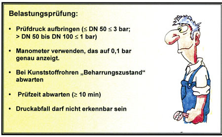 Erst nach Ausführung der Dichtheitsprüfung erfolgt die Belastungsprüfung. Dafür wird mit Druckluft oder Inertgas ein Prüfdruck von 3 bar auf die Leitung aufgebracht. Für Leitungen mit Nennweiten von mehr als DN 50 bis einschließlich DN 100 darf - wegen der noch größeren Gefährdung - der Prüfdruck nur 1 bar betragen. Aus Sicherheitsgründen darf der Prüfdruck nicht abrupt aufgebracht werden; vielmehr ist dieser langsam zu steigern (maximale Druckzunahme 2 bar/Minute). Die Druckmessung muss mit einem Manometer erfolgen, das eine Anzeigegenauigkeit von 0,1 bar hat. Eine Wartezeit für einen Temperaturausgleich ist bei der Belastungsprüfung nicht erforderlich, da temperaturbedingte Schwankungen auf Grund des hohen Prüfdruckes und der geringeren Anzeigegenauigkeit des Manometers nicht auffallen. Werden Kunststoffrohre geprüft oder mitgeprüft, kann sich nach Aufbringen des Druckes ein Druckabfall zeigen. Dieser ist darauf zurückzuführen, dass sich die Kunststoffrohre unter der Druckbelastung ausdehnen, also ihr Volumen vergrößern. Hier kann es erforderlich sein, das Erreichen eines „Beharrungszustandes“ abzuwarten. Anschließend folgt eine Prüfzeit von mindestens zehn Minuten. Innerhalb der Prüfzeit müssen die Rohrverbindungen nochmals gesichtet werden. Wird hierbei kein Mangel erkannt und ist auch kein Druckabfall feststellbar, gilt die Prüfung als mit positivem Ergebnis durchgeführt.