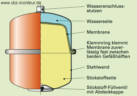 Im Inneren des MAG befindet sich eine Membrane, die den Wasserraum vom Gasraum trennt. Werkseitig befindet sich im Gasraum ein Inertgas, meistens Stickstoff, mit einem Vordruck von 0,5 bis 1,0 bar. Um den Vordruck zu überprüfen, wird das Heizgerät wasserseitig drucklos gemacht. Das ist wichtig, weil man sonst den Anlagensystemdruck – und nicht den Vordruck - messen würde. Durch Diffusion des Stickstoffes verringert sich nach einer Zeit der Vordruck. Dieser ist dann mit Stickstoff zu ergänzen. Dabei darf kein höherer Vordruck, als auf dem MAG angegebenen, aufgebracht werden. Wer hier nach dem „Viel-Hilft-Viel-Prinzip“ arbeitet, macht das MAG funktionslos. Denn ein zu hoher Vordruck verhindert, dass Heizungswasser ins MAG eindringen kann. Ein zu geringer Vordruck hat den gleichen Effekt. Dann steht das gesamte Ausdehnungsgefäß von vorn herein voll Wasser, ein Reservevolumen zur Aufnahme des Ausdehnungswassers gibt es nicht. Aus diesem Grund wird mit der DIN 4807-2 [2] eine jährliche Kontrolle des MAG verlangt.