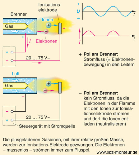 Ionisationselektrode, Sicherheitstemperaturbegrenzer (STB), Gasregelblock mit Wassermangelsicherung, Mindestdruckwächter (Pressostat), NTC’s, Sicherheitsventil und Membranausdehnungsgefäß sind Bestandteile der Sicherheitskette. Fällt ein Bauteil aus, kommt es zu einer Störabschaltung des Gerätes. Meistens passiert das am Wochenende oder an Feiertagen – warum ausgerechnet immer dann, weiß niemand. Gut beraten ist dann natürlich, wer sich mit den einzelnen Bauteilen auskennt und der Ursache des Ausfalls schnell auf die Spur kommt. Ärger machen kann zum Beispiel die Ionisationsflammenüberwachung. Die Ionisationszündüberwachungs-Elektrode ist ein Bauteil, welches in die Flamme des Hauptbrenners hineinragt. Zusätzlich zu der Ionisationselektrode wird für die Flammenkontrolle noch der Gasfeuerungsautomat benötigt. Er ist wiederum kein eigenes Bauteil sondern – bei modernen Geräten mit Einplatinentechnik – Bestandteil der Hauptplatine. Gase leiten den elektrischen Strom normalerweise nicht. Die Gasflamme hingegen ist jedoch in der Lage, elektrischen Strom zu leiten und gleichzurichten. Dieses Prinzip wird Ionisation genannt. Stellt man sich die Gasflamme als Lichtschalter vor, ist das physikalische Prinzip denkbar einfach: Der Gasfeuerungsautomat legt bei Wärmeanforderung eine Wechselspannung zwischen der Ionisationselektrode und dem Brenner an. Diese Wechselspannung ist messbar. Sie beträgt je nach Gasgerät zwischen 20 -75 V~. Die Gefahr einen „gewischt“ zu bekommen besteht angesichts des äußerst geringen Stromflusses also nicht. Sobald eine Flamme entsteht, fließt Strom über die Gasflamme zur Ionisationselektrode. Der Stromkreis ist also – wie z. B. bei einem Lichtschalter – geschlossen.