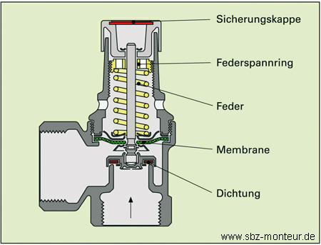 Gefährlichen Überdruck im Heizsystem soll das Sicherheitsventil (SV) verhindern. Meisten im Rücklauf der Heizgeräte angeordnet, fristet es ein ruhiges und beschauliches Leben. Für Warmwasserheizungsanlagen werden meist federbelastete Membran-SV verwendet. Diese sind werkseitig auf einen Ansprechdruck von 2,5 oder 3 bar fest eingestellt. Nach DIN EN 12828 [1] muss jeder Wärmeerzeuger durch mindestens ein Sicherheitsventil abgesichert sein. Bei einer Nennwärmeleistung bis 50 kW beträgt die Mindestnennweite des SV DN 15. Die Ausblaseöffnung muss so angeordnet sein, dass niemand Gefahr läuft, mal einen Schwall heißes Wasser abzubekommen. Da, wo Feuchtigkeit Schaden anrichten kann, muss die Ausblaseöffnung über einen Trichter münden. Einmal im Jahr muss das SV angelüftet (also von Hand geöffnet) werden, damit es im Falle des Falles nicht festsitzt. Aber auch das Gegenteil vom Festsitzen, nämlich ein ständiges Tropfen, muss verhindert werden. Dazu dient das Membranausdehnungsgefäß, kurz MAG genannt. Heizt die Anlage auf, nimmt es das Ausdehnungsvolumen des Wassers auf. Sinkt die Systemtemperatur wieder, führt es das Ausdehnungswasser wieder ins System zurück. Der Wasserdruck in der Anlage bleibt somit konstant. Ist das MAG defekt, hat es diese ausgleichende Funktion nicht mehr. Beim Aufheizen der Anlage steigt der Druck und das SV beginnt zu tropfen. Bei Abkühlung des Systems sinkt der Druck, den es fehlt jetzt das Wasser, welches über das SV abgetropft ist. Wird der Mindestanlagendruck unterschritten, schaltet die Wassermangelsicherung die Anlage ab.