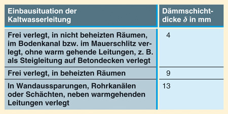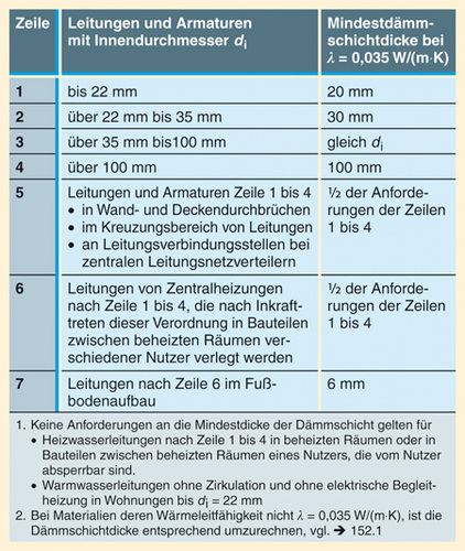 erforderlichen Dämmschichtdicken für Warmwasser führende Leitungen festgelegt.