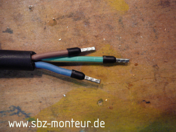 Der grün-gelbe, ist der Schutzleiter (PE) dieser muss so lang sein, dass im Falle eines Versagens der Zugsicherung das grün-gelbe Leitungende als letztes aus der Kontaktschraube reißt. Nachdem die Leitungsenden verdrillt wurden, müssen die zum Leitungsquerschnitt passenden Aderendhülsen aufgequetscht werden.