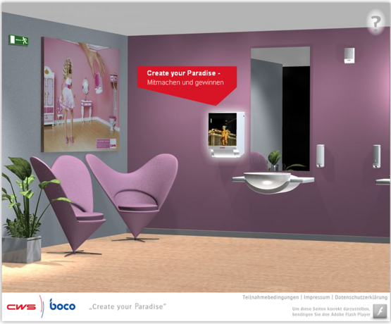 CWS-boco International, sucht die originellsten Ideen für die Gestaltung von Stoffhandtuchspendern. Unter dem Motto „Create your Paradise“ sind Teilnehmer aus der ganzen Welt aufgerufen, Bilder, Fotos, Zeichnungen oder Computergrafiken via Internet einzureichen und so ihr individuelles Frontcover für den Stoffhandtuchspender zu entwerfen. Alle Designs können im Internet begutachtet und bewertet werden. Eine Fachjury kürt die drei besten Einsendungen, die mit 2.000 Euro, 1.000 Euro und 500 Euro belohnt werden. Zudem entscheidet das Online-Voting über den mit 1.000 Euro dotierten Publikumspreis. Der Startschuss für den Wettbewerb fällt pünktlich am 19. November zum Welttoilettentag 2008. Einsendeschluss ist der 31. Januar 2009. Zum Wettbewerb: www.cws-boco.com/competition