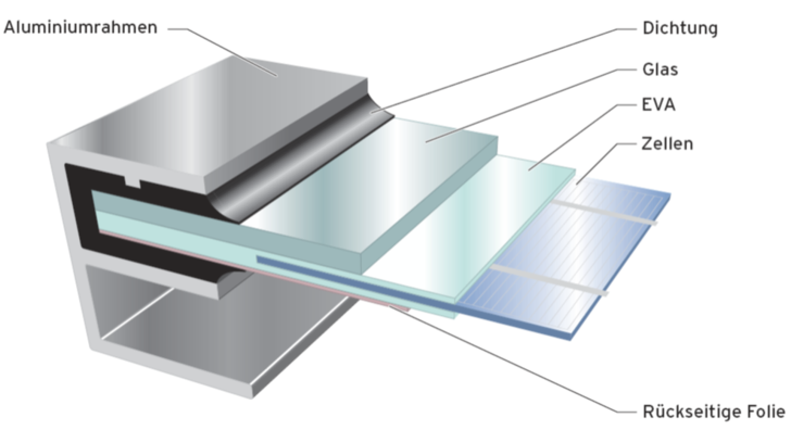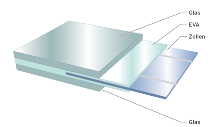Bei der Modulherstellung werden mehrere PV-Zellen elektrisch verbunden und in eine Schicht aus Ethylen-Vinyl-Acetat (EVA) gebettet. In der Vakuumkammer schmilzt bei erhöhter Temperatur das EVA und umschließt Zellen, Frontscheibe und Glasrückwand bzw. Rückseitige Folie. So ist das Photovoltaikmodul dauerhaft vor Witterungseinflüssen und Feuchtigkeit geschützt. Eine Anschlussdose mit Bypassdioden wird auf der Modulrückseite angebracht.