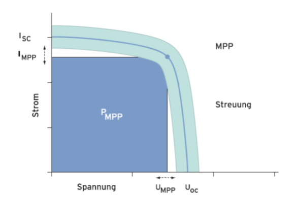 Der Punkt der Kennlinie, an dem das Produkt aus Strom und Spannung am größten ist, wird als Punkt maximaler Leistung „MPP“ – (engl., Maximum Power Point bezeichnet (maximale Fläche unterhalb der Kennlinie im I-U-Kennlinie). Die Lage des MPP ändert sich aufgrund unterschiedlicher Einstrahlung und Temperatur ständig. Daher muss der Wechselrichter zu jedem Zeitpunkt die Betriebsspannung des PVGenerators regeln (MPP-Tracking).