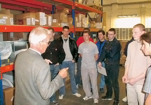 Auch beim Großhändler Hempelmann wurden wir herzlich empfangen und mit Kaffee bewirtet. Mit Matthias Baacke (Technischer Berater in der Verkaufsförderung) führten wir ein interessantes Gespräch über den dreistufigen Vertriebsweg. Seine Aussagen hierzu deckten sich mit unseren zuvor im Hause Wiedemann gemachten Recherchen. Zusätzlich haben wir noch erfahren, dass über 200000 SHK-Artikel in der EDV gespeichert und mit kurzer Lieferzeit verfügbar sind. Davon sind allein 32000 stets im Lager, damit der Handwerker nicht auf diese Ware warten muss. Und dann erfahren wir von Herrn Baacke noch etwas Interessantes: Als Großhandel ist man dem dreistufigen Vertriebsweg verpflichtet, deswegen wird ausschließlich an die Handwerker geliefert. Die Kundschaft besteht aus dem Fachhandwerk Sanitär, Heizung, Klima, Lüftung und Elektrotechnik. Hintergrund ist die Qualitätsverpflichtung. Die Produkte des Großhändlers gewährleisten eine hohe Qualität, die durch einen fach- und sachgerechten Einbau durch das Handwerk sichergestellt wird. Und natürlich hat der Handwerker nun die Möglichkeit, mit einem Aufschlag auf die Produkte seine Kosten und seinen möglichen Gewinn so zu optimieren.