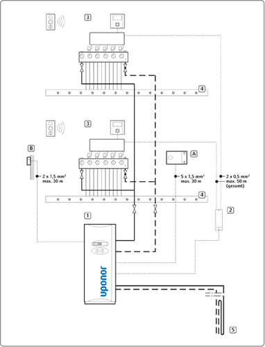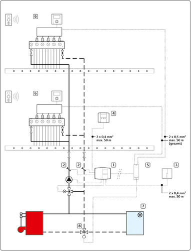 Im Kühlfall sollte die Raumtemperatur und Raumfeuchte überprüft werden. Über diese beiden Parameter wird der Taupunkt ständig berechnet. Hierdurch wird eine Kondensation in Form von Schwitzwasser auf der Flächenkühlung vermieden. Dazu wird ein Fühler in einem Referenzraum vorgesehen. Zu empfehlen sind weitere regelungstechnische Absicherungen. Hier kann als zusätzliche Messgröße die Bodentemperatur über einen Bodenfühler überwacht werden. Eine andere Möglichkeit ist die Überwachung der Kondensaterfassung am Boden mittels Taupunktfühler an sensiblen Stellen des Flächenkühlungssystems. Nach EnEV besteht die Pflicht, jeden Raum einzeln mit einem Raumregler auszurüsten. Ein weiteres Argument für eine Einzelraumtemperaturregelung begründet sich mit den Komfortansprüchen der Nutzer. Niemand möchte in allen Räumen eines Gebäudes die gleichen Innentemperaturen. Untergeordnete oder selten genutzte Räume werden tiefer geregelt. Andere Räume, wie beispielsweise Bäder, werden individuell höher eingestellt. Die Einzelraumregelung muss für die Kühlung geeignet sein. Die Regelung sollte eine Option beinhalten, Räume, die der Nutzer nicht kühlen möchte, wie z. B. Bäder, auszuschließen. Hinsichtlich einer Tauwasserbildung bieten Heizkreisverteiler aus Kunststoff Vorteile gegenüber solchen aus Metall. Denn der Kunststoff bietet hier ähnliche Eigenschaften wie eine Kältedämmung.