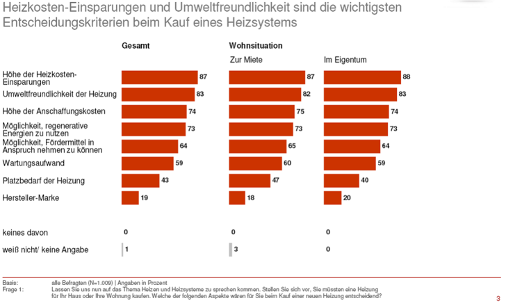 Danach sind für 87 Prozent der Befragten die Höhe der Heizkosten-Einsparungen sowie die Umweltfreundlichkeit der Heizung (83 Prozent) ein entscheidender Aspekt beim Kauf einer neuen Heizung. Weniger bedeutend sind für die Befragten die Höhe der Anschaffungskosten (74 Prozent) und die Möglichkeit, regenerative Energien zu nutzen (73 Prozent). Eine finanzielle Unterstützung durch den Staat mittels Fördermittel ist lediglich für 64 Prozent ein wichtiges Entscheidungskriterium. Unabhängig von der Wohnsituation sind die Ergebnisse bei Mietern und Eigentümern nahezu deckungsgleich.
