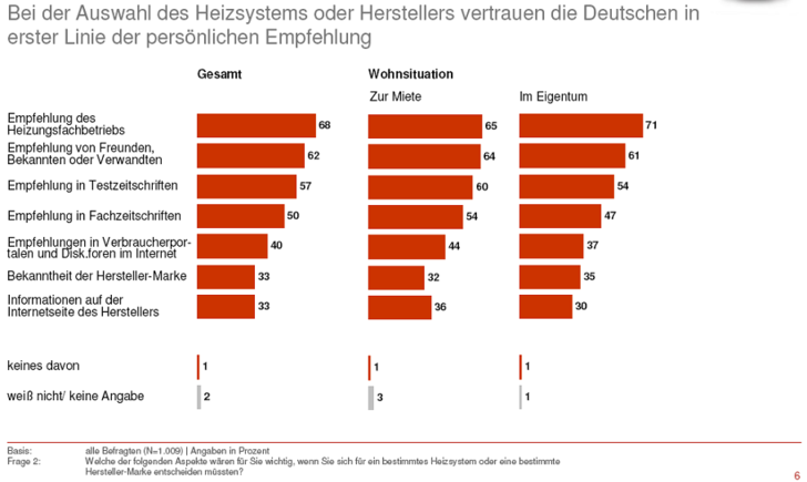 Bei der Produkt- und Markenwahl nehmen vor allem die persönliche Empfehlung durch den Heizungsfachbetrieb und der Rat von Freunden und Bekannten einen hohen Stellenwert ein. Gleichzeitig vertrauen Kunden nicht mehr nur einer Empfehlung, sondern nutzen zur Informationsbeschaffung verschiedene Quellen. Verbraucherportale und Diskussionsforen im Internet haben dabei einen überraschend großen Einfluss auf die Kaufentscheidung.