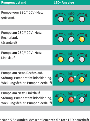 Das Funktionsprinzip und der Aufbau des „Wilo-Drehrichtungsindikators“ sind denkbar einfach und mit dem eines Kompasses vergleichbar. Der Indikator bezieht die Energie aus dem Motorstreufeld. Eine Batterie ist daher nicht erforderlich. Er besteht aus einer drehbar gelagerten rotweißen Scheibe, die hinter einer durchsichtigen Plastikkappe liegt. Wird er an ein Wechselstromfeld herangeführt, beginnt die Scheibe im gleichen Drehsinn wie der Motor zu rotieren, so dass die Drehrichtung der Pumpe festgestellt werden kann. Fängt die Scheibe an, sich zu drehen, bedeutet das, dass sich der Pumpenmotor in Betrieb befindet.